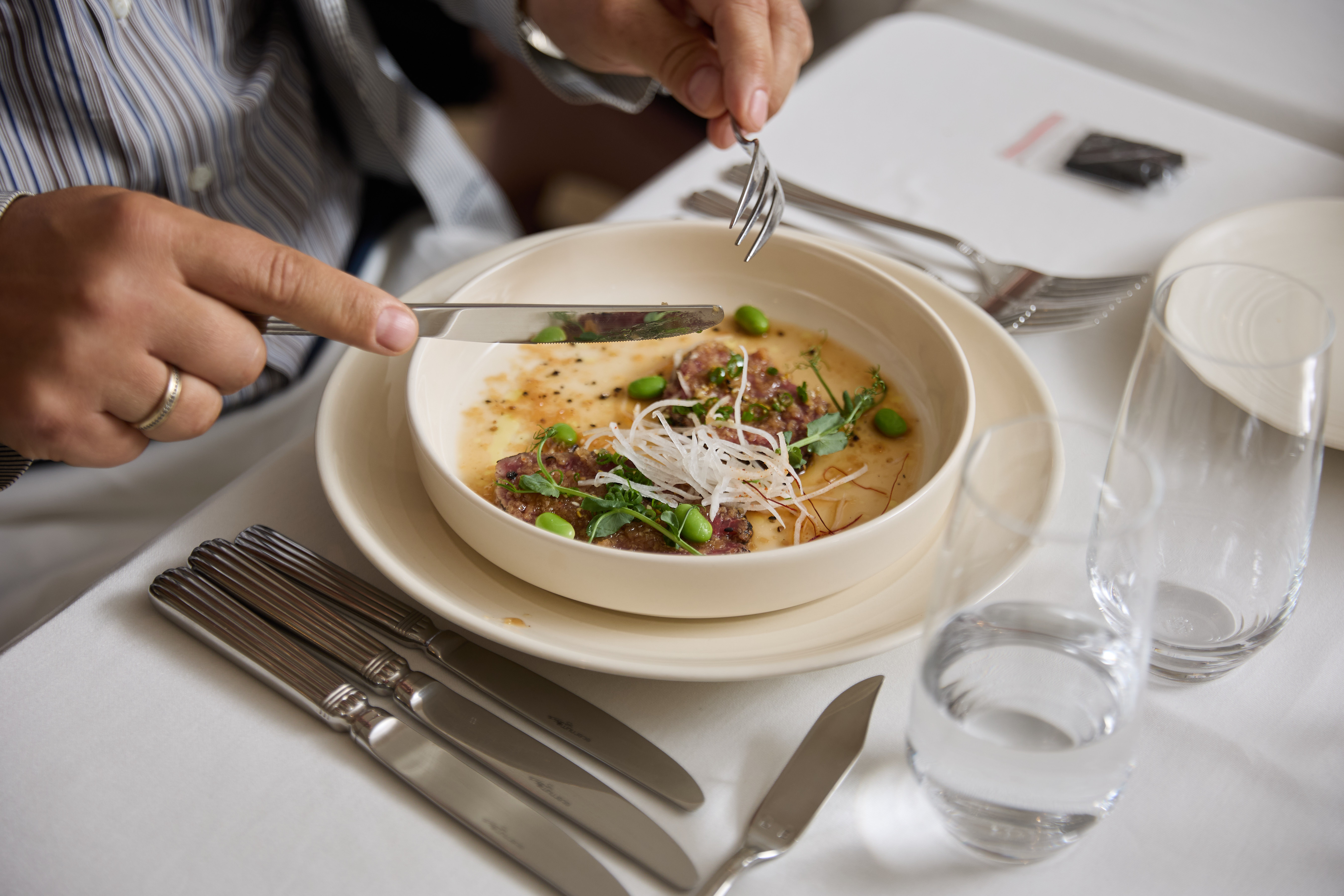 Дегустацию провели в необычной форме: гости оказались в «гастрономическом театре». Перед подачей каждого блюда звучала музыкальная композиция, а на большом экране появлялся слайд-картина известного художника. Для лосося с икрой подобрали произведение Дебюсси и картину Матисса «Красные рыбы», а для десерта (шоколадных бисквита и мусса) – концерт для флейты Моцарта и клубничный сад художника-сюрреалиста Яцика Йерко. Музыку и картины заранее выбрала психолог Валерия Елецкая, которая сообщила, что придумать необычные композиции ей помогли знания по нейрогастрономии, а также любовь к музыке и живописи.